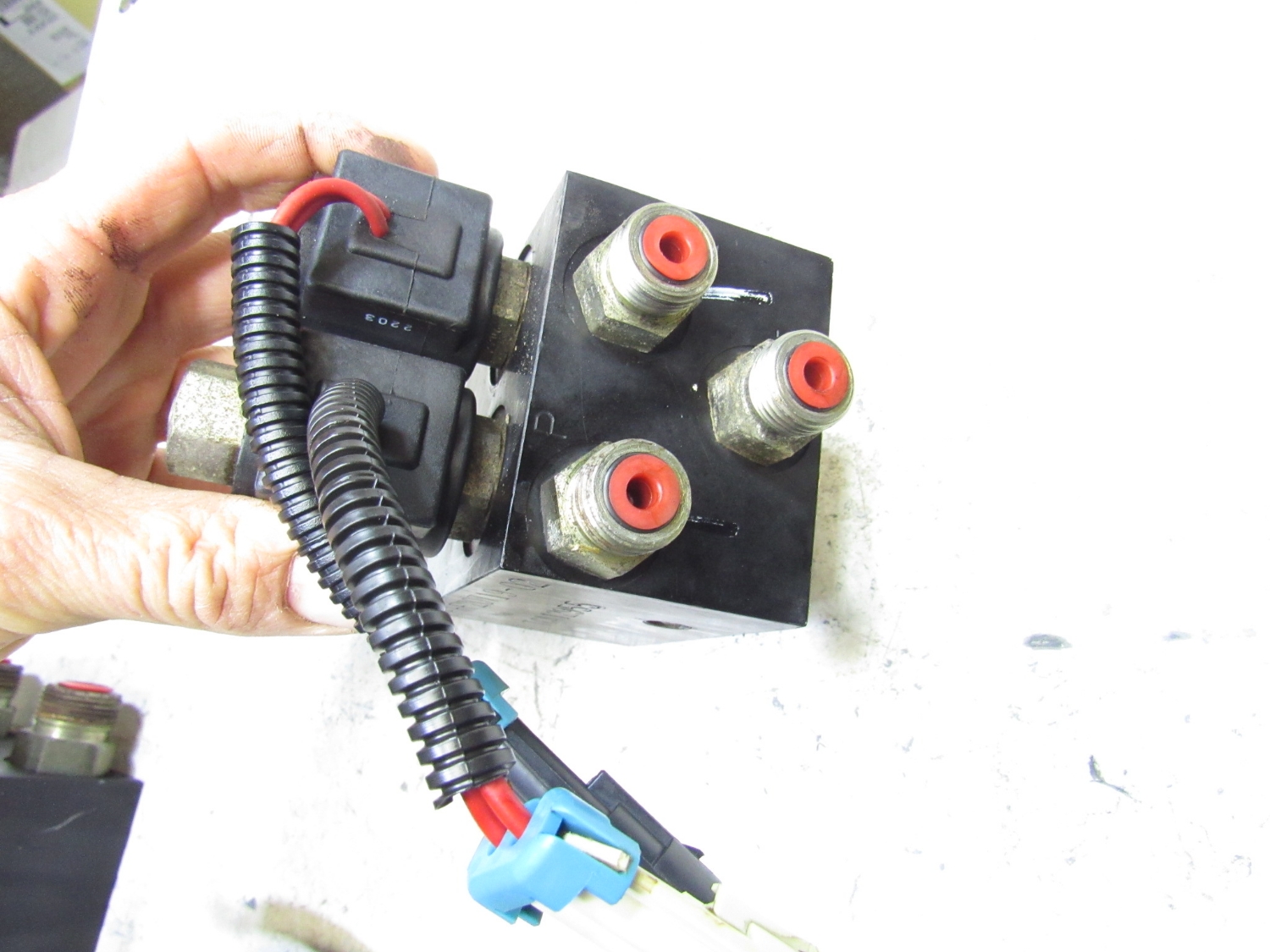 This valve lifted the cutting units up and down on the machine, but it is possibly only power one way and float the other
