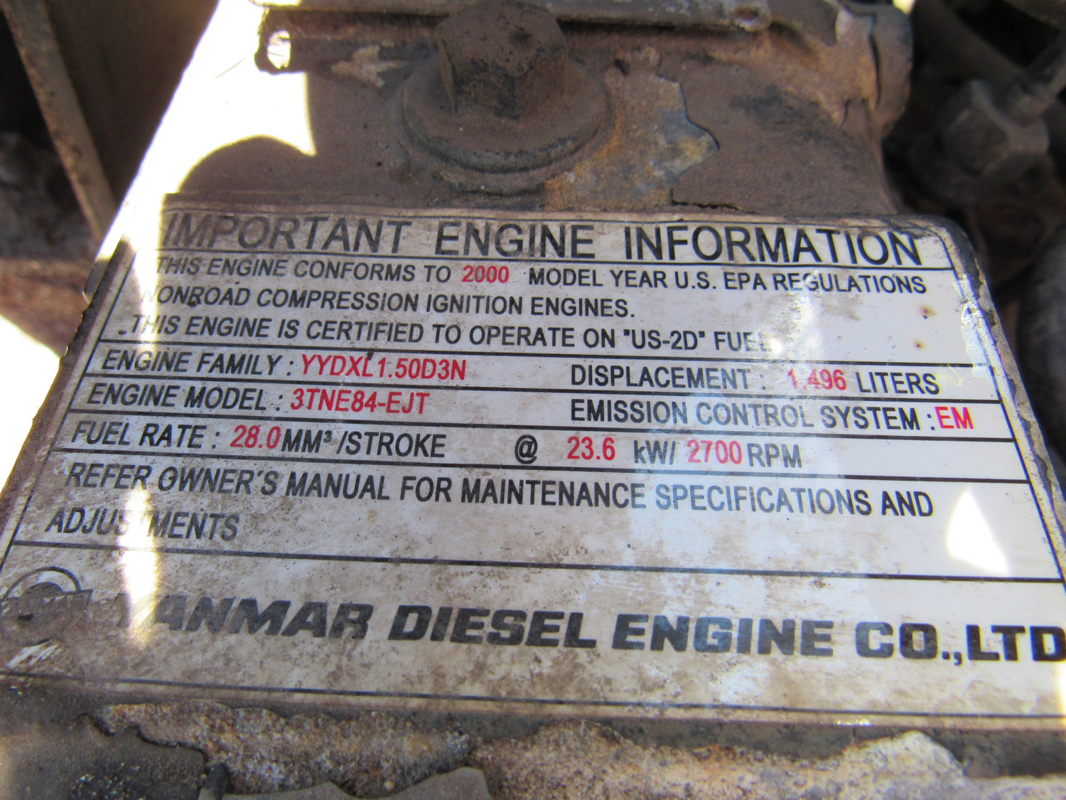 2000 Yanmar 3TNE84-EJT Diesel Engine out of John Deere 4300 Tractor 3TNE84